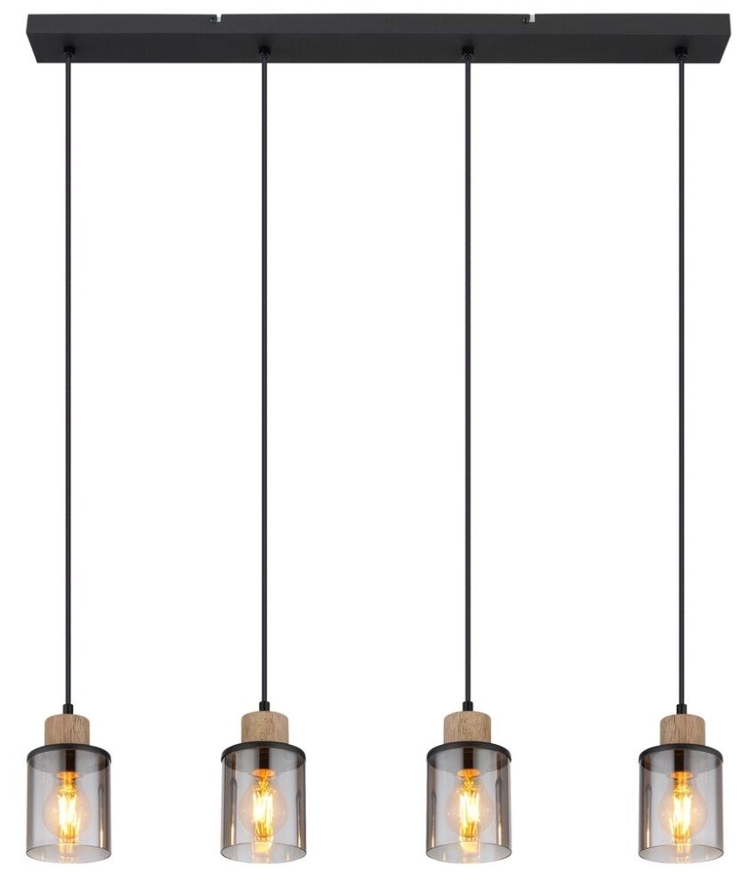 This beautiful pendant lamp from the REID series inspires with its great design and becomes the center of your living area. The lamp consists of 6 smoky glass shades with decorations in wood look, each of which has an E27 socket and hangs from the ceiling attached to 6 black cables. The E27 sockets allow you to use bulbs of your choice, up to a maximum power of 15 watts. pendant lamp metal black matt, wood dark brown, glass smoke colored, cable PVC black, Height reducible, LxWxH: 780x100x1200mm, excl. 4x E27 15W 230V